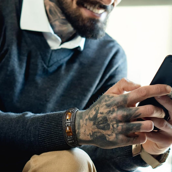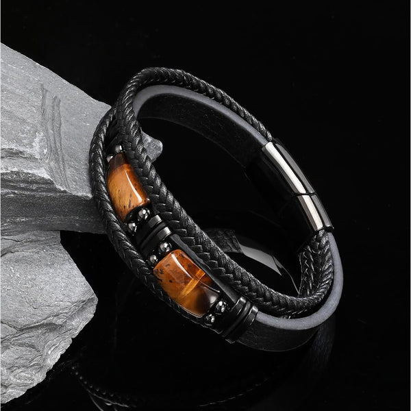 Embrace your inner strength with this striking natural tiger eye stone bracelet. Handcrafted from supple black leather intricately braided by skilled artisans, each piece features genuine tiger eye stones known for their mesmerizing golden-brown bands and grounding energy. Built to withstand daily wear, this bracelet develops character over time, becoming more distinctive as it ages. Perfect for the man who values authenticity and isn't afraid to stand out. A meaningful accessory that transcends typical jewelry—wear it as a symbol of confidence and resilience. Ships from the USA. Ships free. Estimated delivery time: 7 days.